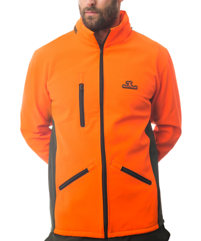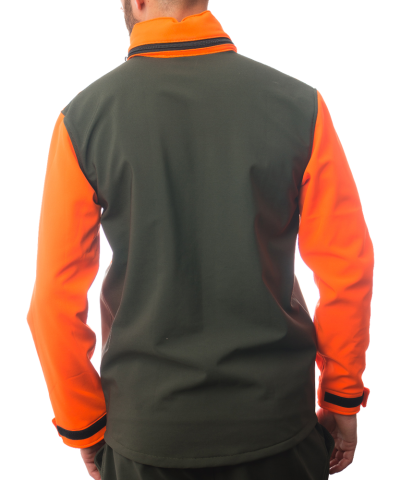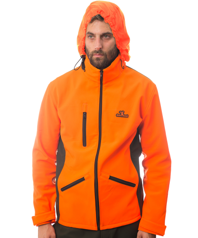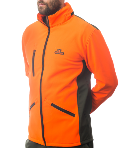 Lovačka jakna izrađena u high vis efektom (visoka vidljivost na terenu) narandžaste boje i zelene boje. Troslojni materijal, unutrašnjosti ćebaste, sa membranom i vodoodbojne spoljašnosti.