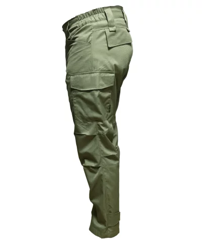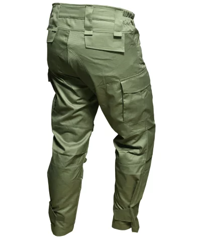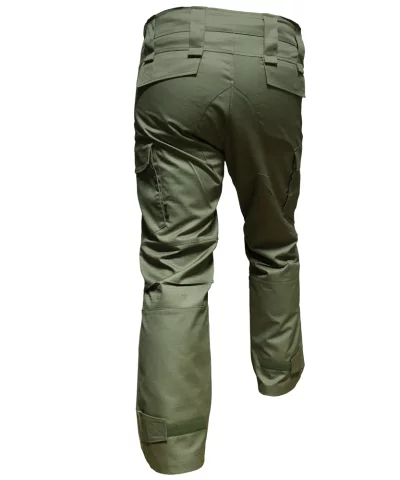 Pantalone sadrže blagi leđni greben, dok se na bokovima nalaze rastegljiva proširenja za bolje prilagođavanje linijama tela. Takođe, na struku su široke gajke za lovački opasač.