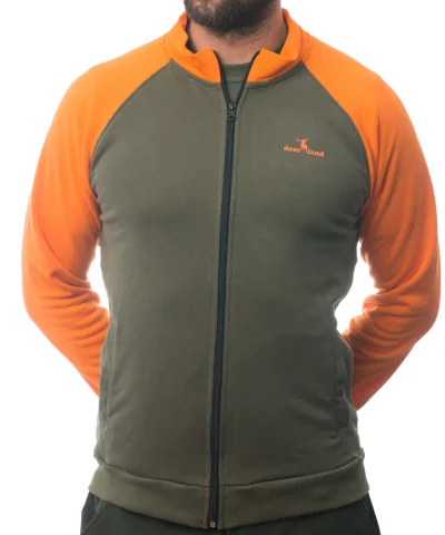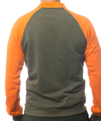 Lovački duks izrađen od premium pamuka (vrhunski nebrušeni pamuk) u maslinastoj boji sa ranglanim rukavima koji su izrađeni u fluo oranže boji.