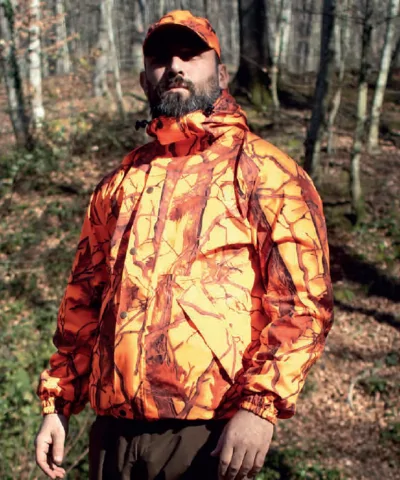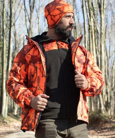 Savršena vodo otporna lovačka jakna izrađena za aktivan zimski lov, izrađena u Camopic narandžastoj šari sa high vis osobinom (visoka vidljivost na terenu). Izrađena od meke poliesterske tkanina rastegljive u 2 pravca, vodootporna i prozračna sa ugrađenom PTFE Breathtex+ membranom koja je laminirana.