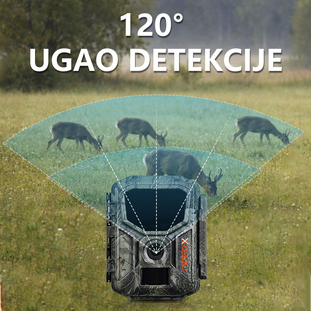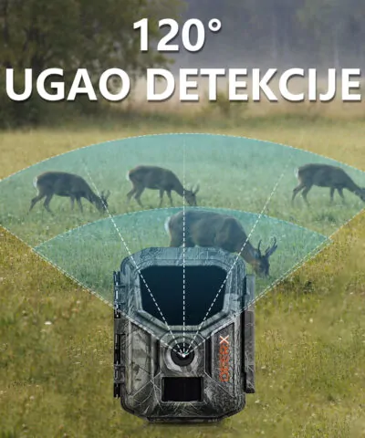 Uz PIR senzor, kamera za lov detektuje pokret u širokom uglu od 120 stepeni, sa dometom od 15 do 20 metara. Ova funkcija omogućava efikasno pokrivanje velikih površina bez potrebe za dodatnim uređajima.