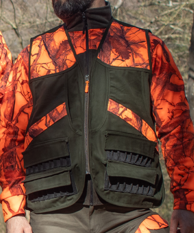 Lovački prsluk izrađen od 100% pamučne tkanine otporne na cepanje, sa amortizerima s preda na oba ramena. Prsluk je izrađen u Camopic fluo orange šari sa high vis svojstvom (visoka vidljivost na terenu). Prsluk poseduje veliki leđni džep-torba za odstreljenu divljač. Džep je obložen blood-proof taninom (tkanina koja ne propušta krv!).