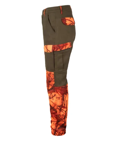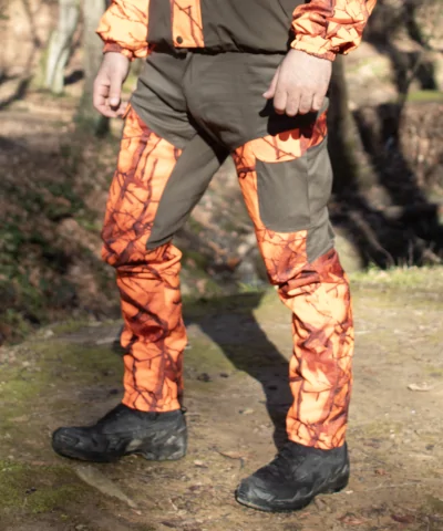 Lovačke pantalone premium izrade za zimski lov. Izrađene u Camopic narandžastoj šari sa hihg vis osobinom (visoka vidljivost na terenu). Pantalone poseduju sertifikovanu Breathtex membranu koja im daje vodootpornost. Materijal izrade je premium i veoma je otporan na granje i sve terenske uslove. Trostruki šavovi na pantalonama garantuju robusnost i isključuju lako pucanje. Elastin im daje svojstvo pokretljivosti i idealnog prijanjaja uz telo.