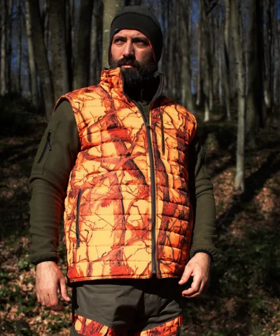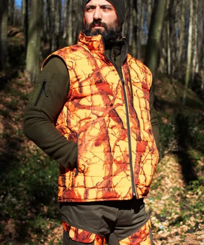 Moderan lovački prsluk izrađen u Camopic narandžastoj šari sa high vis osobinom (visoka vidljivost na terenu).